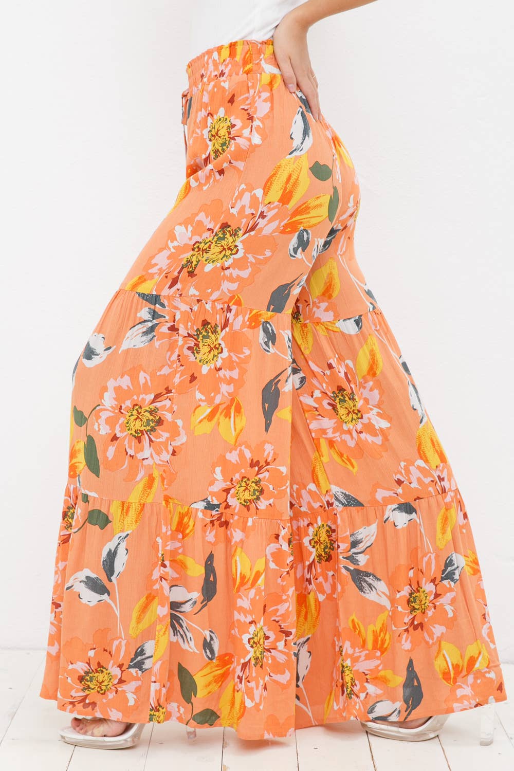 Expertly crafted from a lightweight rayon material, these citrus floral tiered pants feature a wide tiered design for added movement and a shirred leg for a flattering fit. Complete with an elastic waistband and tassel tie, they offer both comfort and style for any occasion.