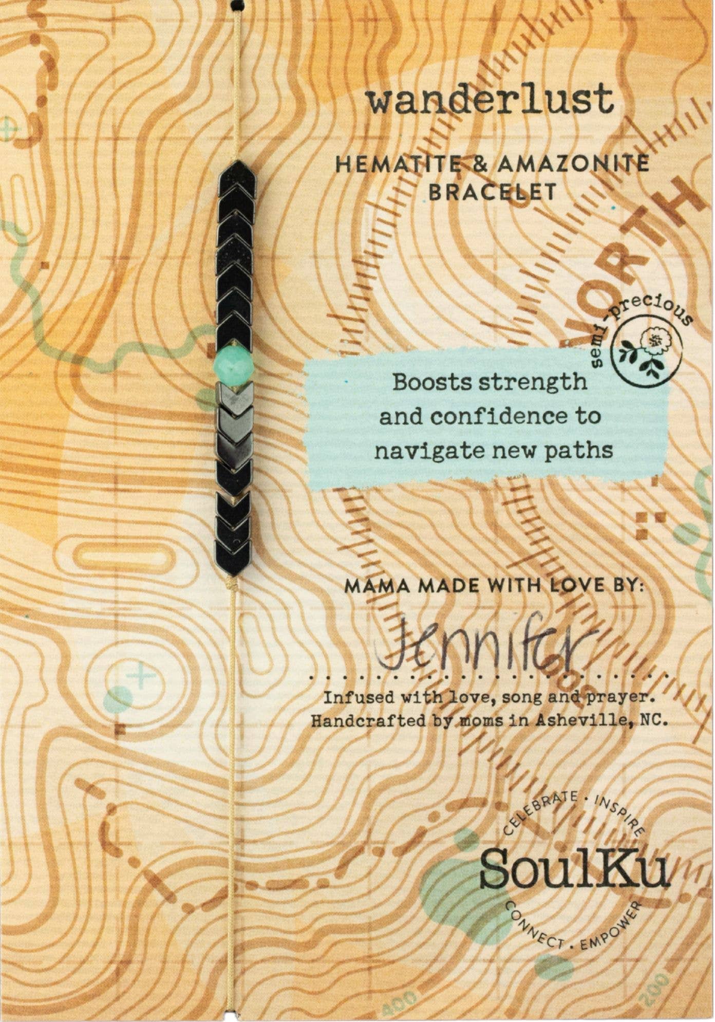 Discover confidence and grounding with the Amazonite Adjustable Bracelet from Wanderlust. Featuring a central faceted Amazonite gemstone surrounded by 14 hematite beads, this waterproof bracelet is perfect for everyday wear and adventure. The dark brown nylon cord adjusts easily for a comfortable fit. Handmade by SoulKu in Asheville, NC, it’s an ideal gift for any occasion and a daily reminder to trust your journey.