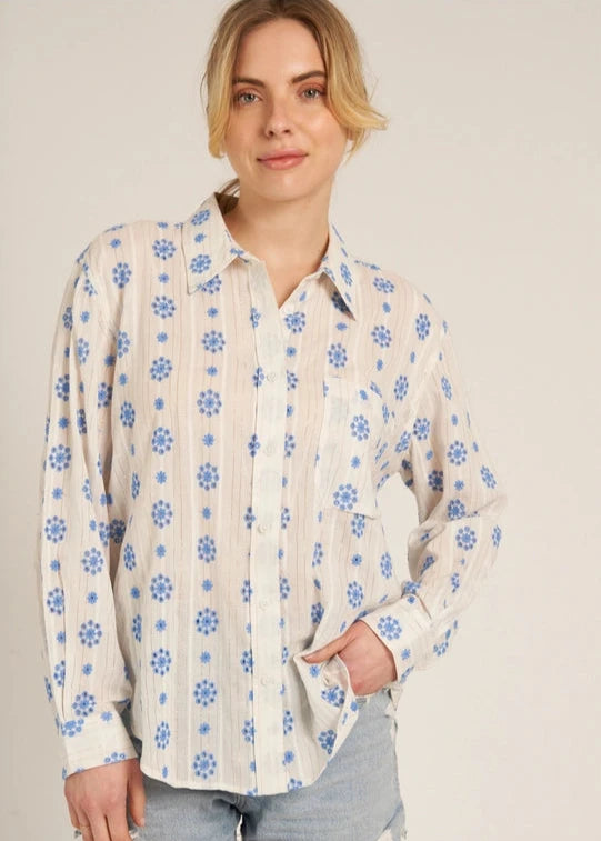 Introducing the Kat Button Down, the perfect blend of comfort and elegance. Made from 99% cotton and 1% metallic, this blue and ivory long sleeve shirt is both durable and stylish. Its eyelet detail adds a touch of sophistication, making it suitable for any occasion.