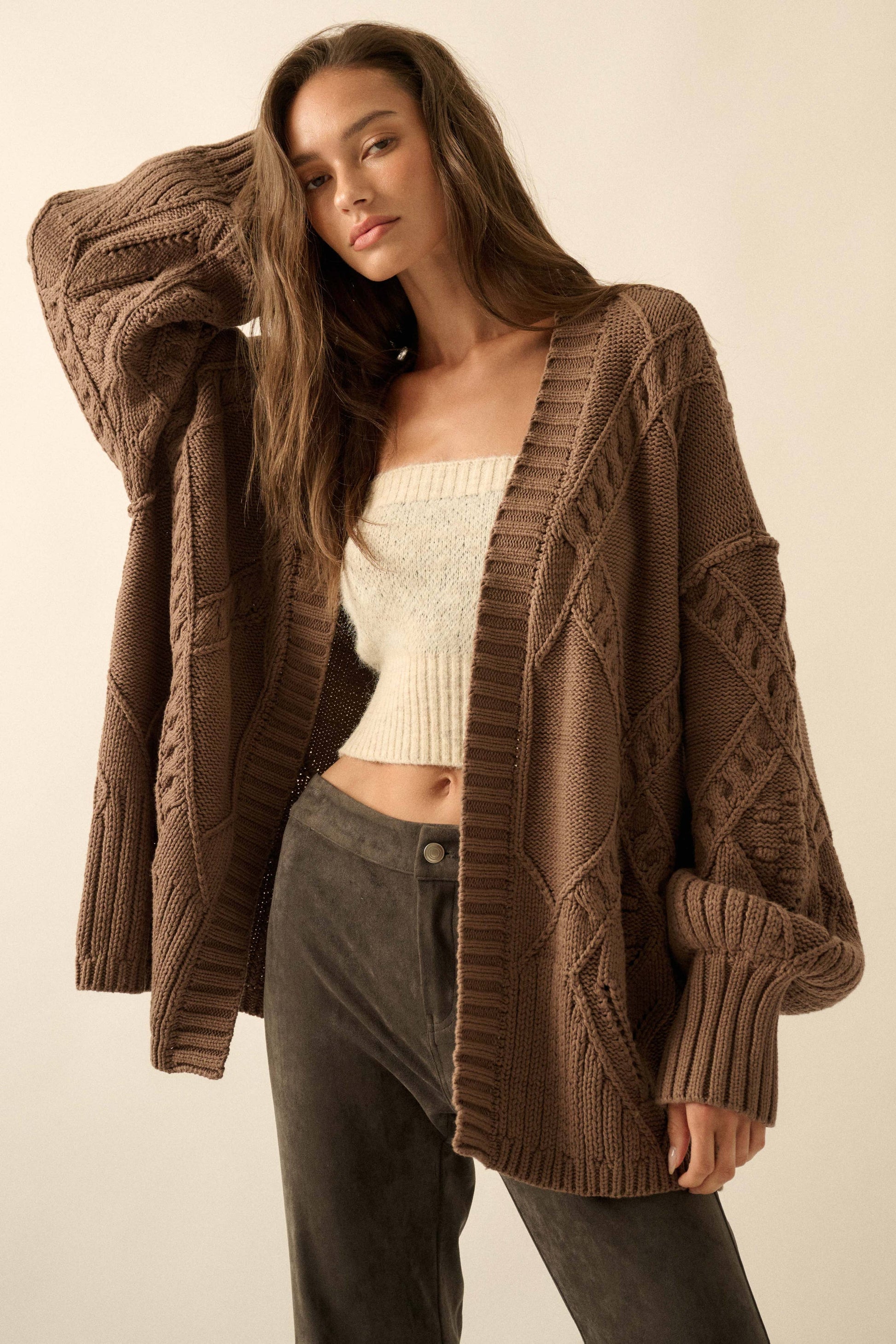 A cable knit cardigan sweater with the following features: Open front. Long balloon sleeves with rib-knit cuffs. Drop shoulder. Exposed seams. Oversized fit.