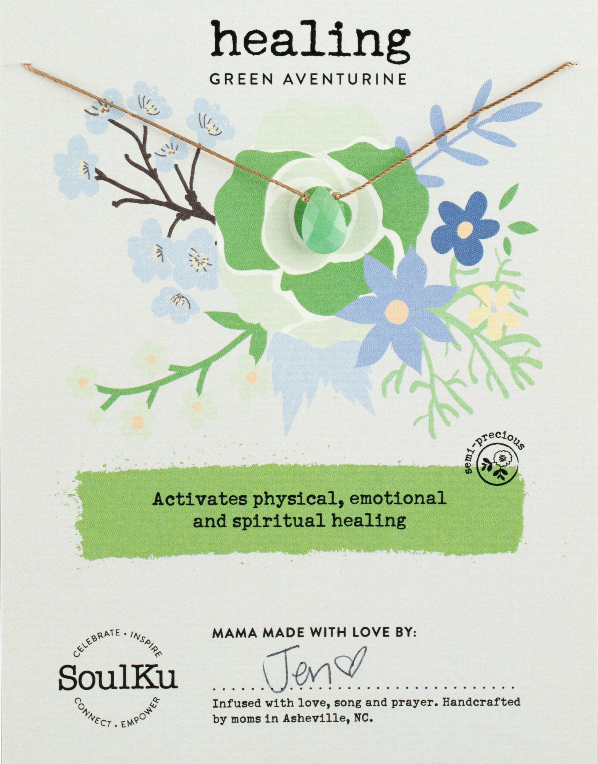 This Green Aventurine necklace brings loving vibes to boost your physical, emotional, and spiritual healing. It’s like a cozy hug for your heart, promoting calm and well-being. Featuring an 8 x 10 mm gemstone on a 16" cord with a stainless steel extender to stretch up to 18". Secure with a stainless steel lobster clasp and durable Mighty Miracle nylon cord, plus a cute FSC-certified card. Handmade with love by SoulKu’s mama makers in Asheville, NC since 2011. A fun gift for birthdays, Valentine’s, Mother’s Day, or any day that needs a little extra sparkle!!
