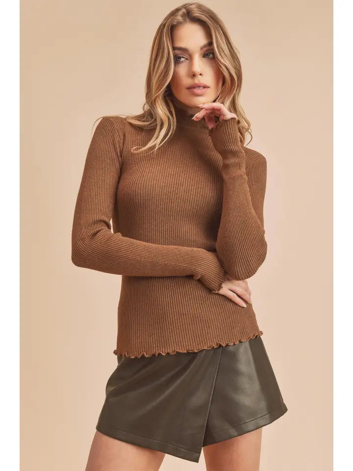 The Marcey Caramel Sweater is a classic and versatile piece perfect for any occasion. Its mock neck and lettuce hem detailing add stylish touches, while the cozy material will keep you warm and comfortable. Dress it up with a skirt and boots or wear it casually with joggers - either way, you'll look and feel great.