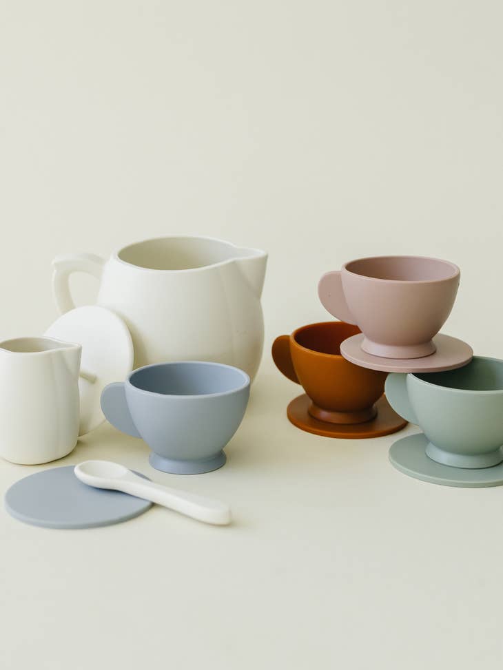 Marlowe & Co's Silicone tea set is modern and timeless and is designed to spark imaginative play, develop social skills, and provide endless tea party fun! Our 12 piece tea sets are thoughtfully designed with love and care. They are available in classic neutral colors and are perfect for the modern family. They are perfect for tea parties, picnics, sensory or water play, and bath time! Made from 100% food grade silicone, they are BPA free, PVC free, phthalate free, lead free and CPSC tested to ensure the highest quality and safety for your little one. Because they are made from silicone they will not crack or break over time like plastic. Our tea sets feature a tea pot and lid, four tea cups, four saucers, one cream pitcher, and one spoon. Care Instructions: Hand wash or place in the top rack of the dishwasher. Air dry or wipe with a clean cloth to remove any water drops.