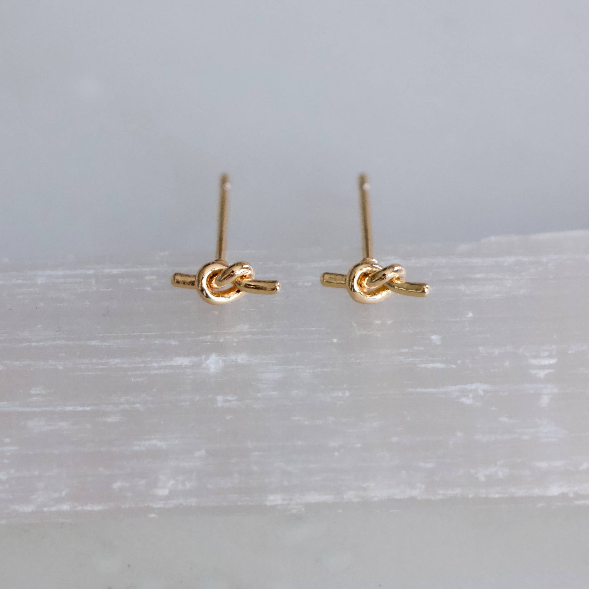 Delicate and lightweight, these Tiny Love Knot Stud Earrings are crafted with 18K gold plating over brass, ensuring they are free of lead and nickel. Measuring a petite 3x7mm, they offer an elegant touch perfect for everyday wear.