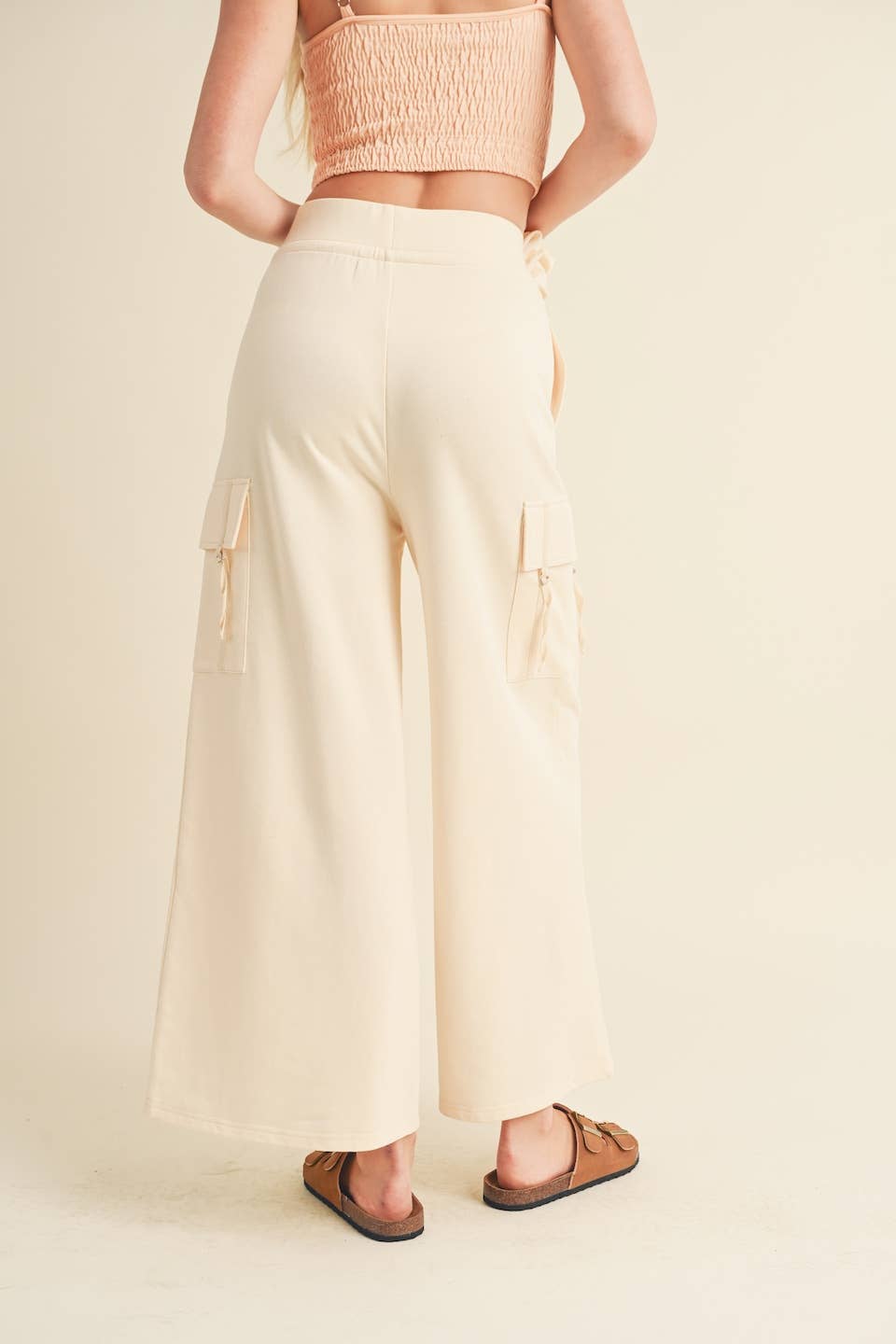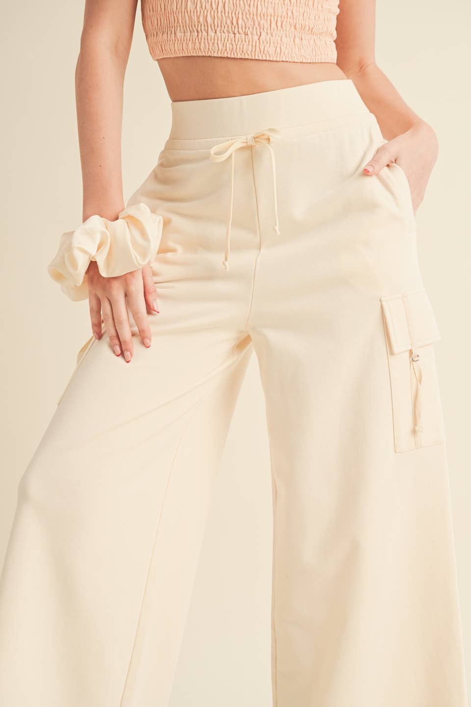 The perfect wide leg pants. High waisted elastic waistband, adjustable drawstrings, and four pockets for all your essentials 85% Cotton, 15% Polyester